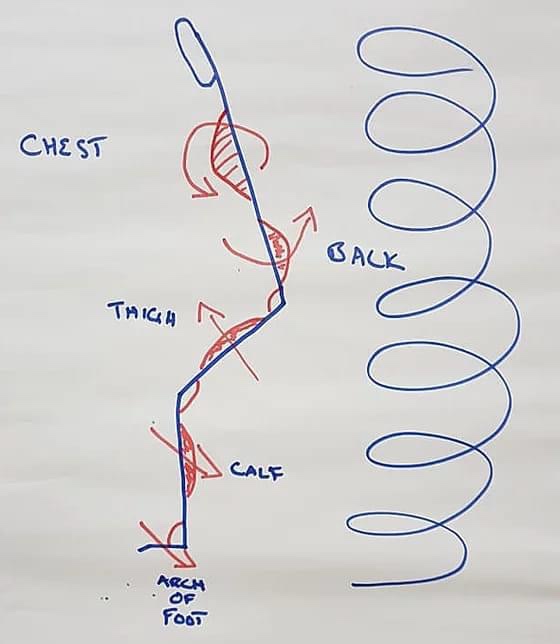 The deep front line is the soft tissue core that runs connected from behind the ears to the arches of the feet and manipulates the spine in all the above movements.