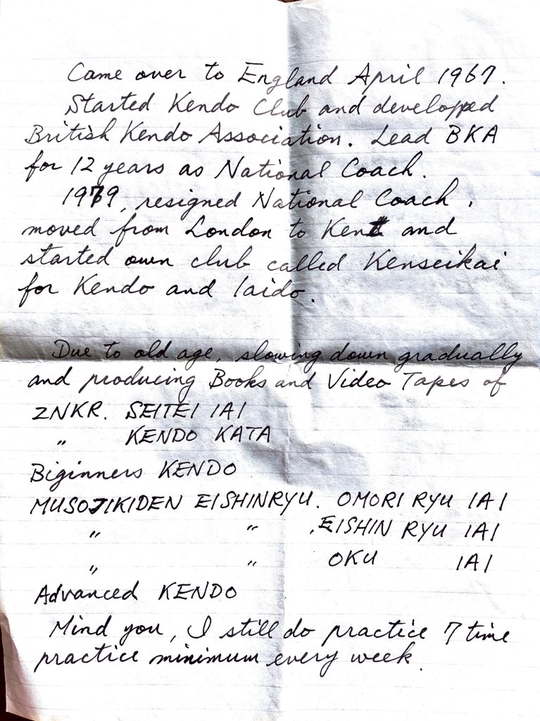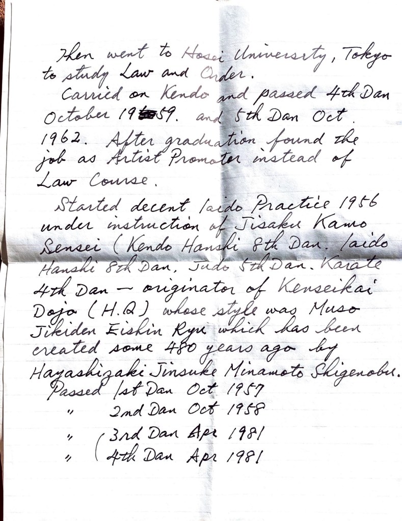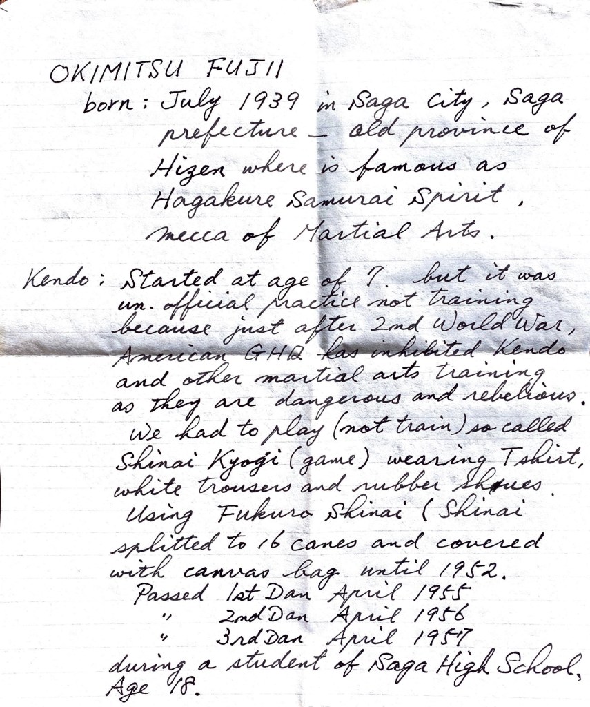 This is Okimitsu Fuji’s hand written history and the photos he gave me at the time, must have been in the 1980’s. I used to have private lessons with him every Tuesday morning for many years, I’d go to his house and wake him up, we’d go to the Irishman’s club in Dartford where he’d give me a private lesson. We became good friends and he was a good Japanese cook so he would cook for me and my family. My daughter Caroline would call him ‘Uncle Oki’ and I also took Toru Takamizawa and his wife to his house to meet him. He was a good man, a great martial artist and a good friend with no arrogance of any kind. I learned a lot about Japanese Budo and Iaido from him that I could not get from anywhere else. I miss him.