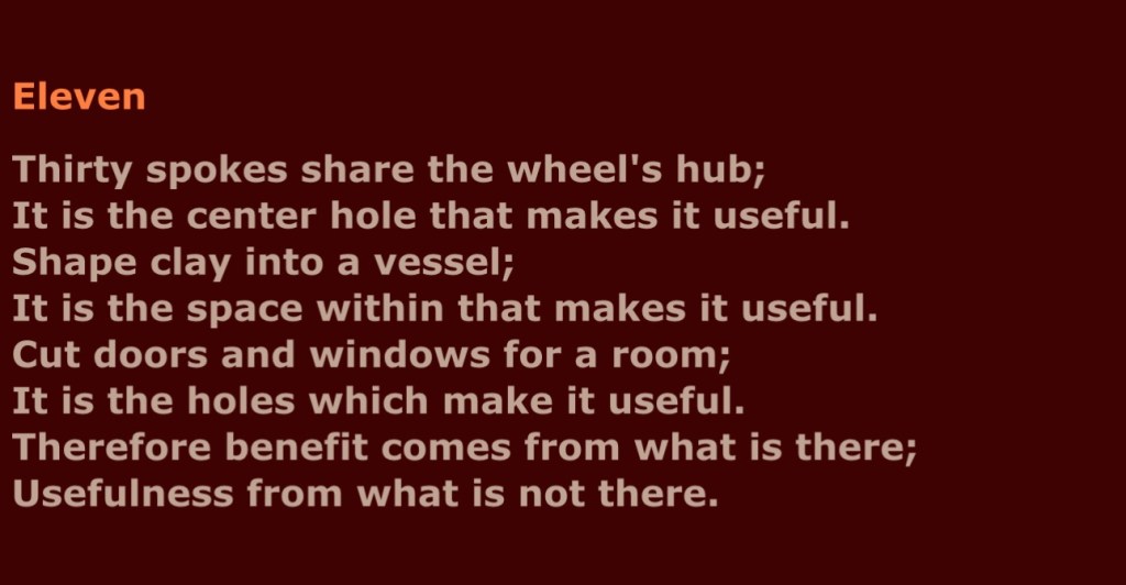 ‘Some thing’ can only exist by the grace of ‘no thing’. Space, apart from filling the void is 99.9999999% of an atom. If the space was removed from a human body the remaining matter would be as big as a speck of dust. It pervades everything and contains our and the universe’s consciousness, it is potent, loaded with potential and that which the ‘ten thousand things’ rise and fall from, it’s largely unrecognised by the human mind, a bit like a fish doesn’t recognise water.
