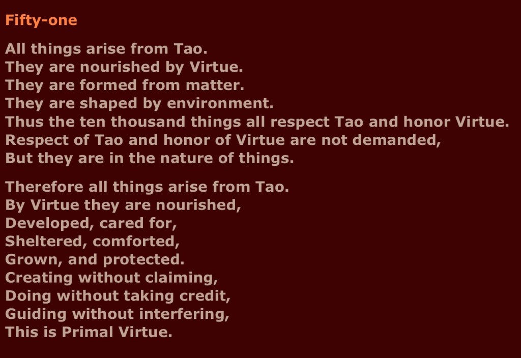 Thus the ten thousand things all respect Tao and honor Virtue.