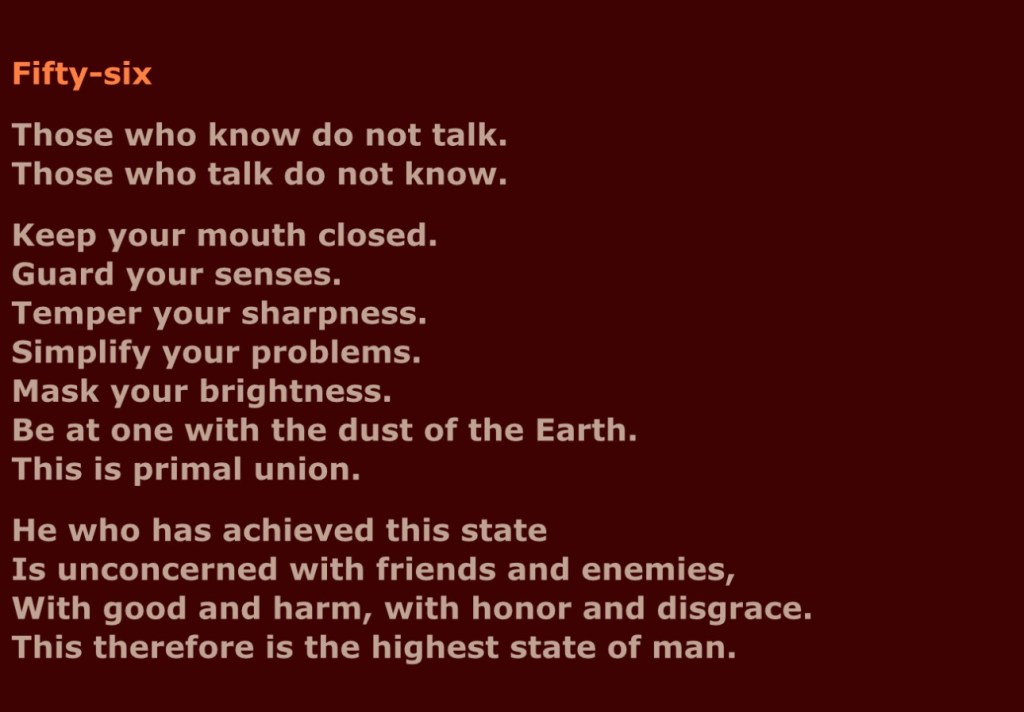 The best way to do this is to keep our mouth closed, guard our senses and turn them inwards. To not show off, live in a simple and humble way, to be ‘at one with the dust of the earth’ is remain immersed in our source (the Tao) this is our ‘primal union’.