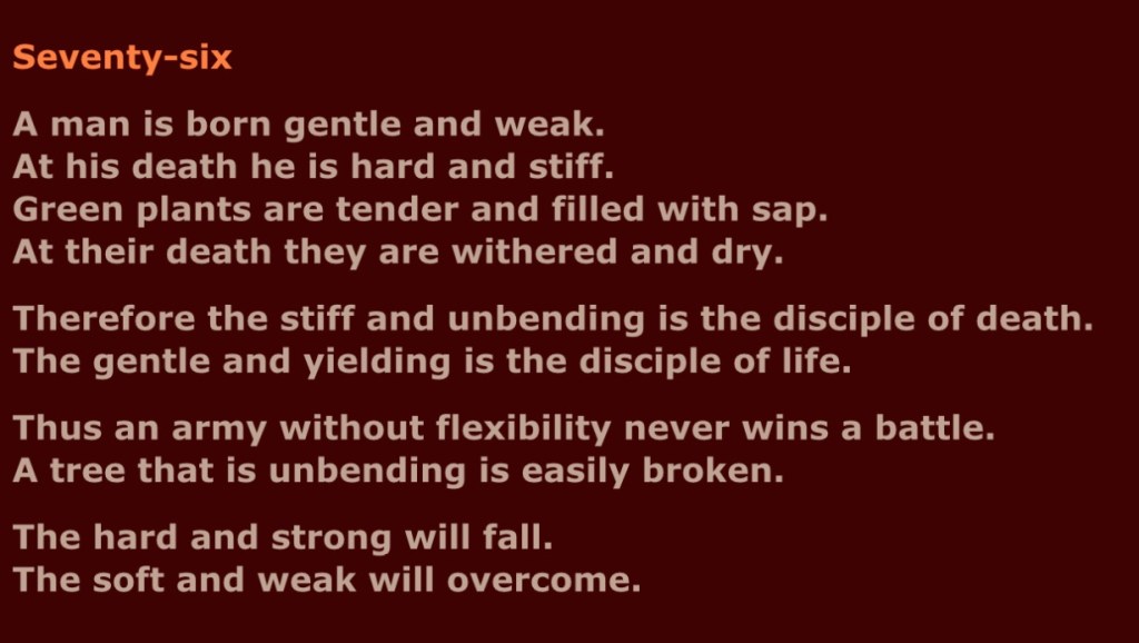 This is about the power of softness and yielding and how it overcomes the hard and unyielding. It gives the examples of how it works. Those of us that practice Tai Chi utilise this power both physically and strategically all the time and are well aware of how powerful it is.